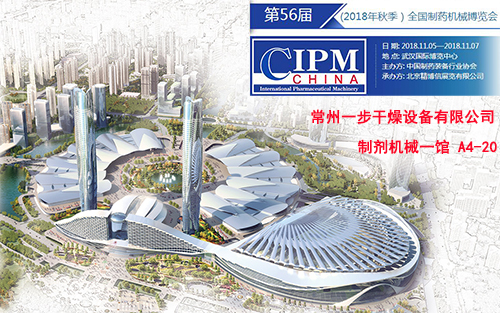 2018年11月5日-7日,第56屆2018年秋季全國制藥機械博覽會,將在武漢國際博覽中心隆重舉行。常州一步展位號:制劑機械一館 A4-20。