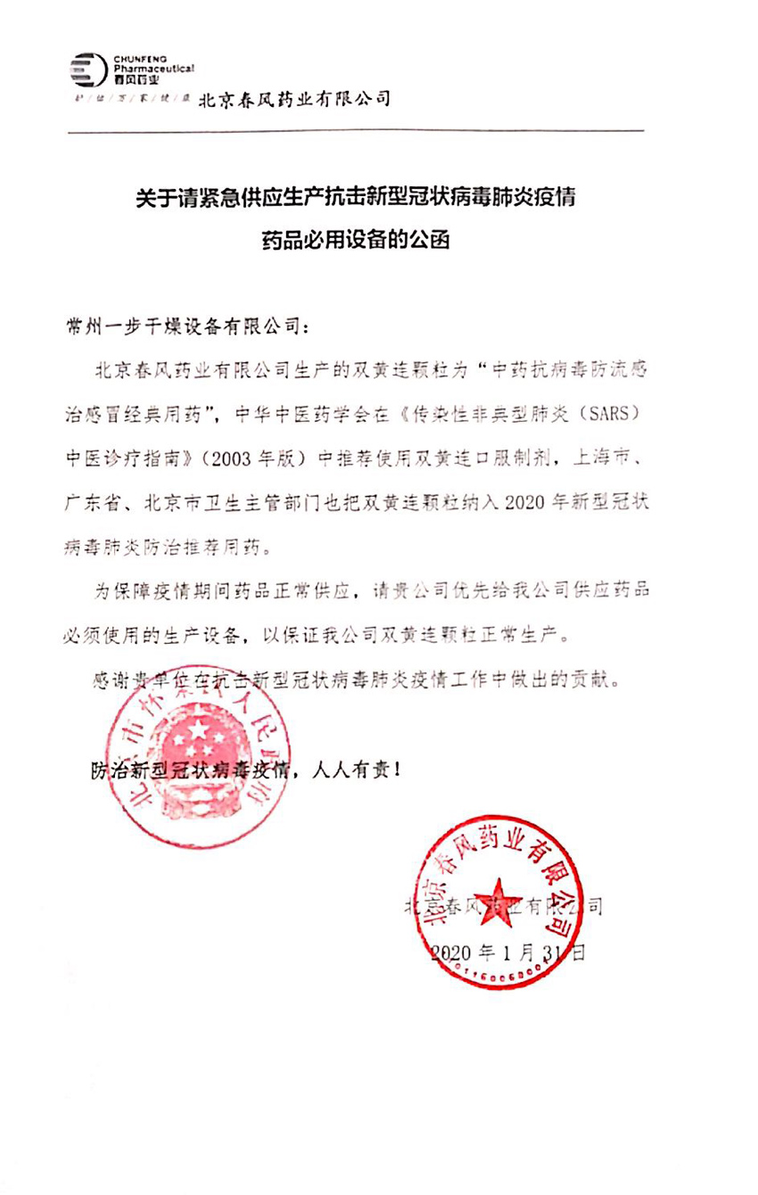 2020年1月31日,北京市懷柔區人民政府蓋章發來公函,請緊急供應北京春風藥業有限公司急需的抗擊新冠狀病毒肺炎疫情藥品必用設備。春風藥業年前選定的一步公司生產的FL-500型一步制粒干燥機提前發貨,在車間主任、制粒班組以及拋光,電工、激光落料、線切割、鈑金、氬孤焊等相關人員、各工種的配合下,突擊到2月2日1點深夜完工發出,直運北京春風藥業。為抗擊新型冠狀病毒一步在行動,這是一步速度、一步精神,在此對本項目的參與人員致敬!