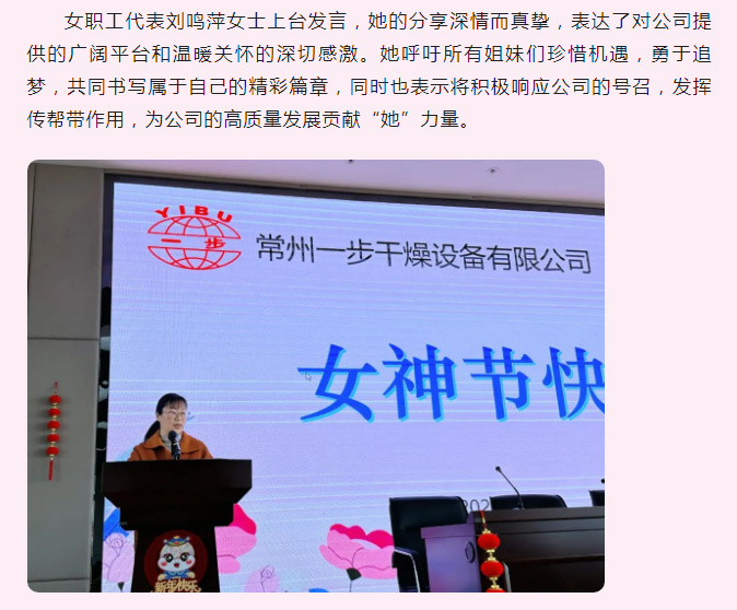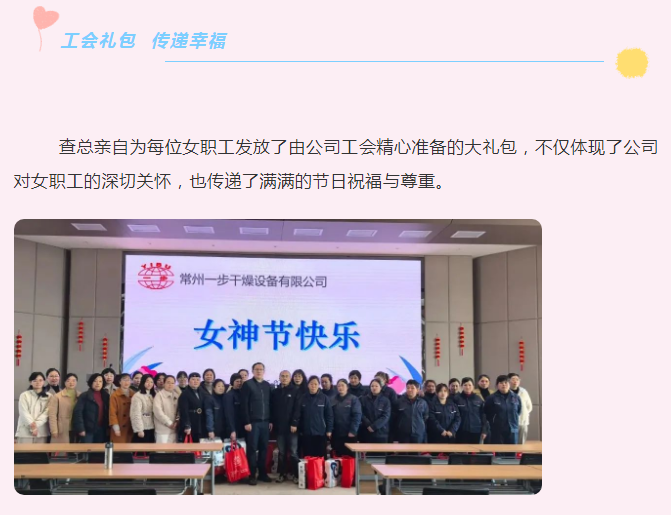 在這個(gè)春意盎然、萬(wàn)物復(fù)蘇的美好時(shí)節(jié),我們迎來(lái)了第115個(gè)國(guó)際勞動(dòng)?jì)D女節(jié)。3月8日上午,一步干燥舉辦了一場(chǎng)溫馨而富有意義的婦女節(jié)慶祝活動(dòng),以“春風(fēng)如你,熠熠芳華”為主題,向每一位辛勤付出的女職工致以最誠(chéng)摯的祝福與敬意。