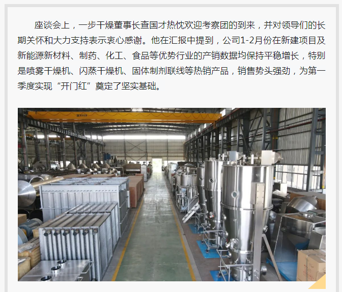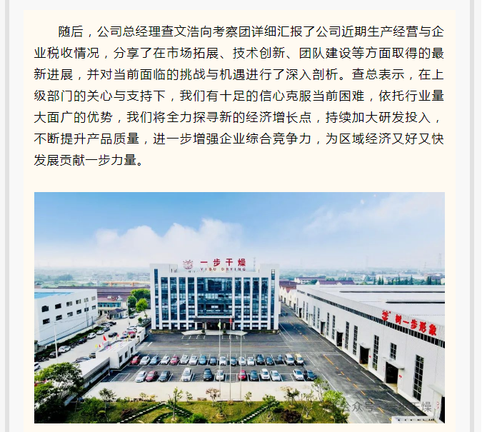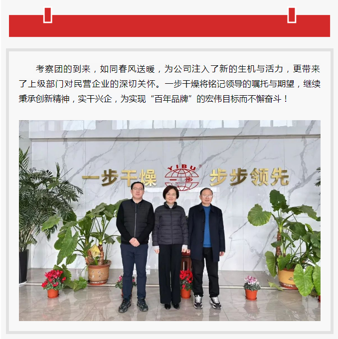 2025年3月7日上午,常州市天寧區人大常委會主任沈月芬率隊赴常州一步干燥設備有限公司調研,鄭陸鎮人大主席黃佳清陪同考察。一步干燥董事長查國才、總經理查文浩熱情接待。