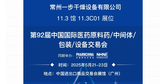 2025 年 5 月 21-23 日,第 92 屆中國國際醫藥原料藥 / 中間體 / 包裝 / 設備交易會(API China)將在廣州?中國進出口商品交易會展館盛大舉辦。屆時,常州一步干燥設備有限公司將攜原料藥干燥裝備、固體制劑制粒干燥聯線、中藥配方顆粒智能化生產線等整體解決方案亮相本屆展會。常州一步干燥設備有限公司誠邀您蒞臨 11.3 館 11.3C01 展位,共探醫藥干燥領域新機遇!
