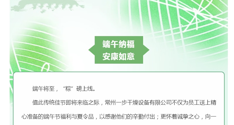 值此傳統佳節即將來臨之際,常州一步干燥設備有限公司不僅為員工送上精心準備的端午節福利與夏令品,以感謝他們的辛勤付出;更懷著誠摯之心,向一直以來信任與支持公司的新老客戶、關注公司發展的社會各界朋友致以最美好的祝福。愿大家在這個粽香四溢的時節,萬事順遂,幸福安康,愿端午的吉祥與美好常伴左右!