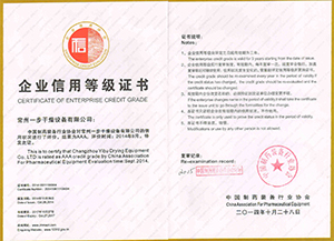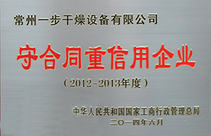 一步干燥在查國才董事長的帶領下,一直以“約守信誠,鑄就品牌,高質量服務,贏得市場”為企業宗旨,公司先后被授予“國家高新技術企業”、“國家守合同重信用企業”、“江蘇省AAA級重合同守信用企業”、“江蘇省質量誠信五星級企業”,還通過了制藥裝備行業信用評價體系,并被為“AAA”,等多項榮譽。長期以來,公司始終堅持誠信經營,共同發展的信譽理念,樹立“一步”品牌,提高在國內外的知名度。