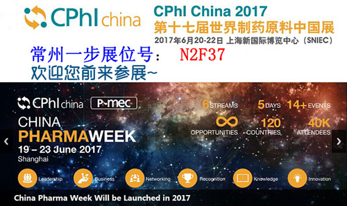 CPHI China 2017世界制藥原料中國展將于2017年6月20-22日,在上海新國際博覽中心隆重召開。感謝新老客戶多年來對常州一步的支持,一步展位號是:N2F37,歡迎各位前來參觀洽談合作。