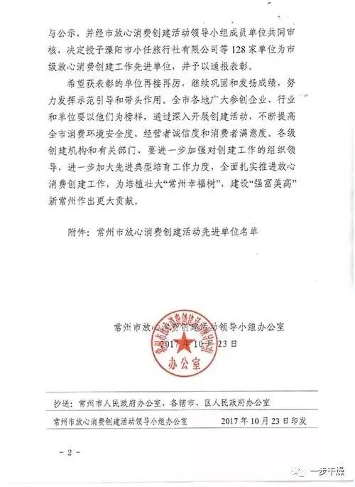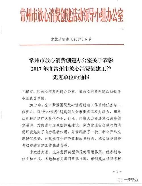 近日,常州市放心消費創建活動辦公室對2017年度常州市放心消費創建工作中,效果明顯、成績突出的先進單位進行了通報表彰,常州一步榜上有名。