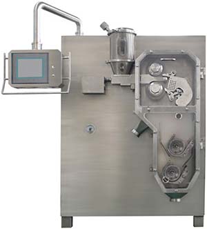 在干法制粒機中,擠壓裝置包括電動機驅動的液壓系統施以高壓的擠壓輪組,物料進入擠壓裝置后被擠壓輪組擠壓,從而獲得所需要狀態的物料。現有技術中,物料在擠壓過程中會不可避免造成溢料、密度不均勻、物料粘附擠壓輪表面,同時也會影響擠壓輪的工作,造成擠壓輪間隙的變化,密度、厚度不均勻,導致產品擠壓質量差。