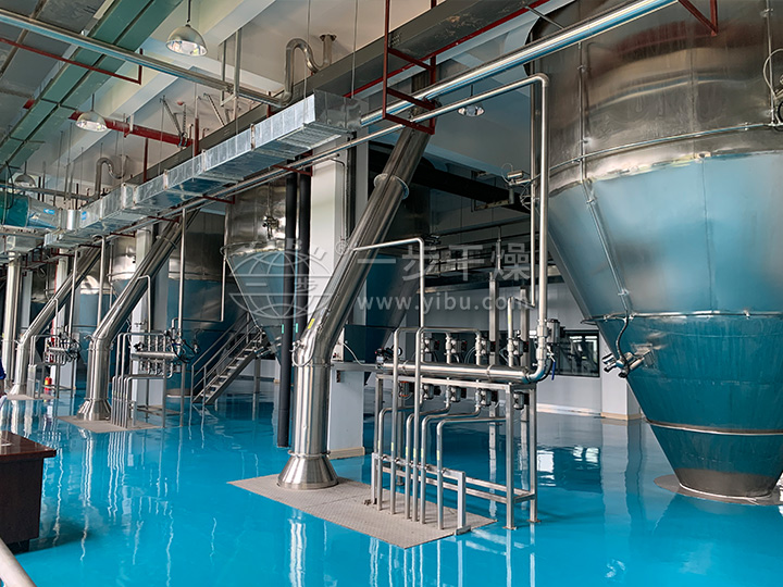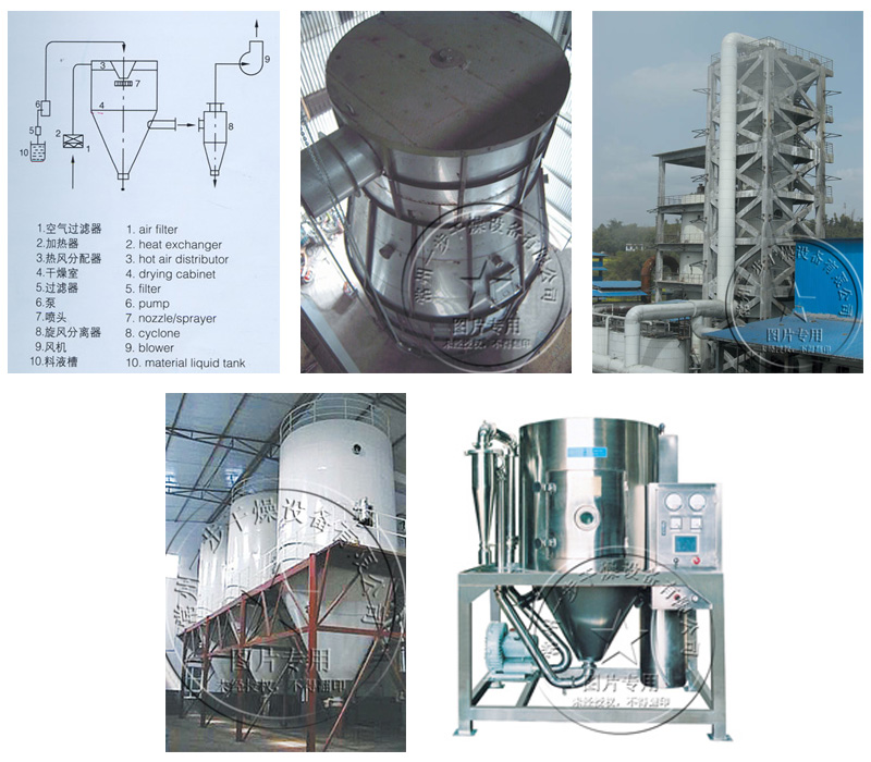 空氣經過濾和加熱,進入干燥器頂部空氣分配器,熱空氣呈螺旋狀均勻地進入干燥室。料液經塔體頂部的高速離心霧化器,(旋轉)噴霧成極細微的霧狀液珠,與熱空氣并流接觸在極短的時間內可干燥為成品。成品連續地由干燥塔底部和旋風分離器中輸出,廢氣由風機排空。